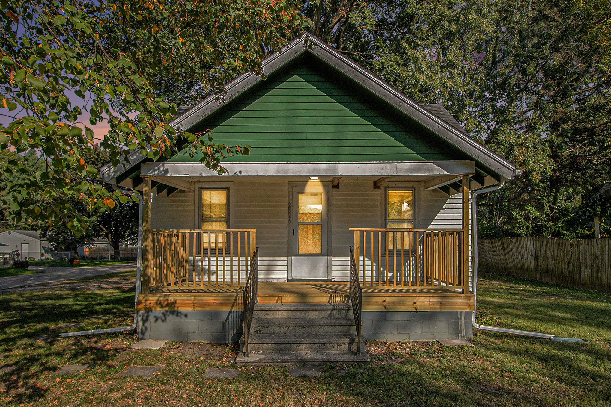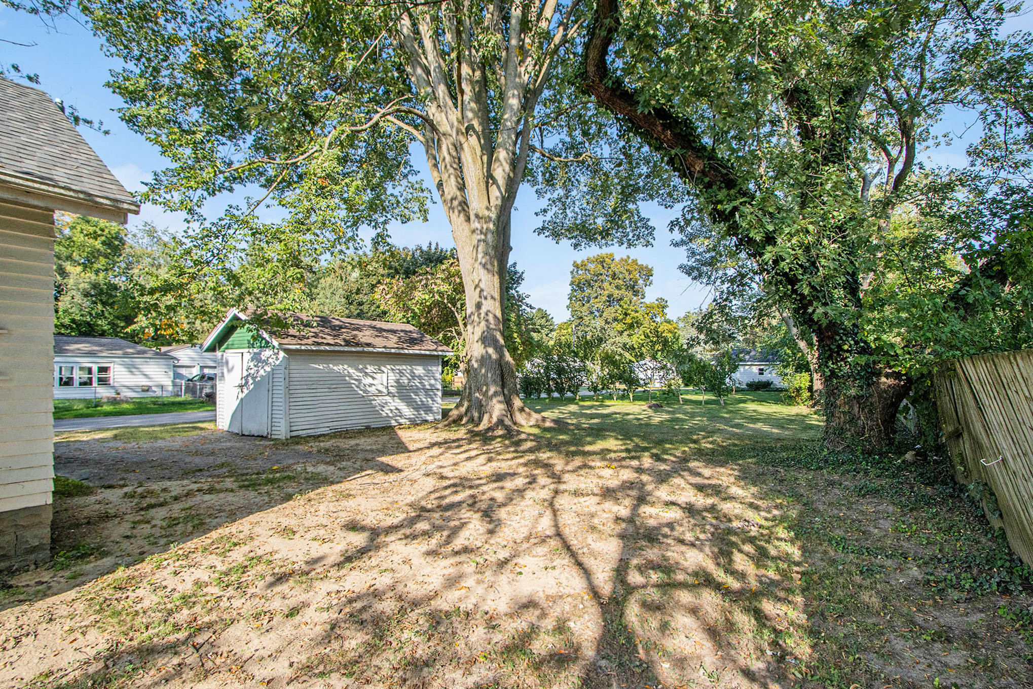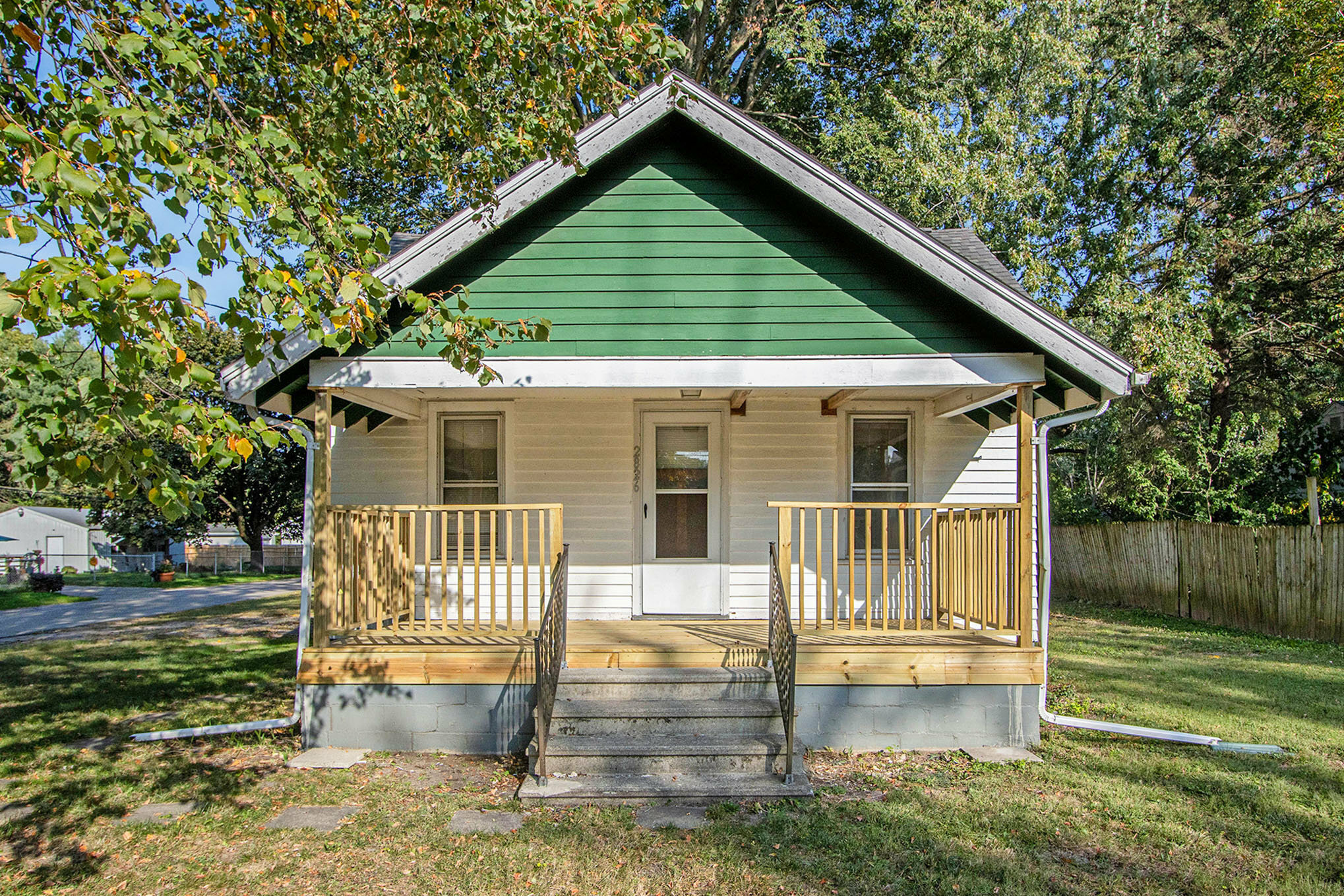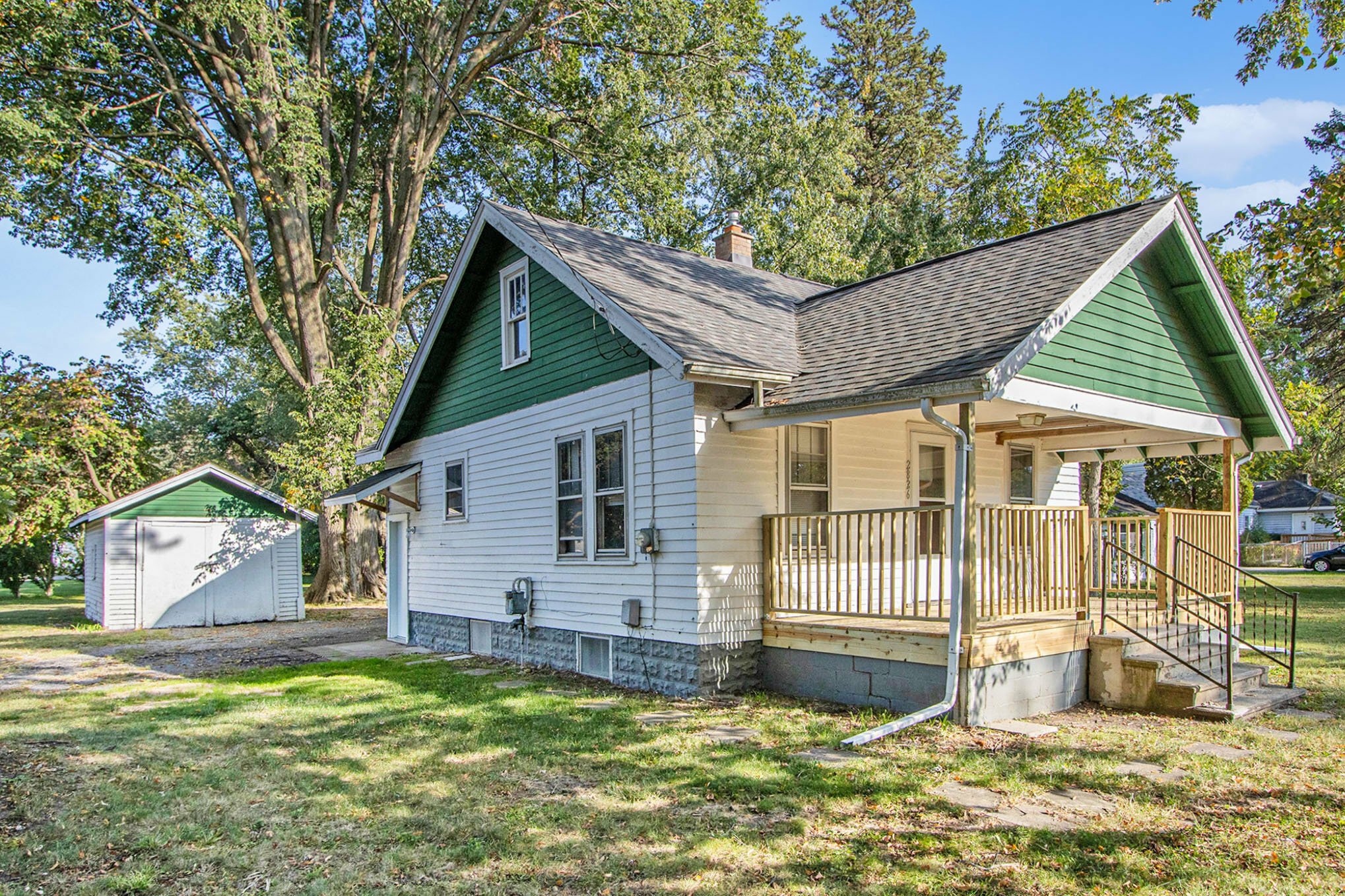 Charming 2-bedroom bungalow with covered porch, basement, stove, refrigerator, laundry hookup, all window coverings, and large storage shed.