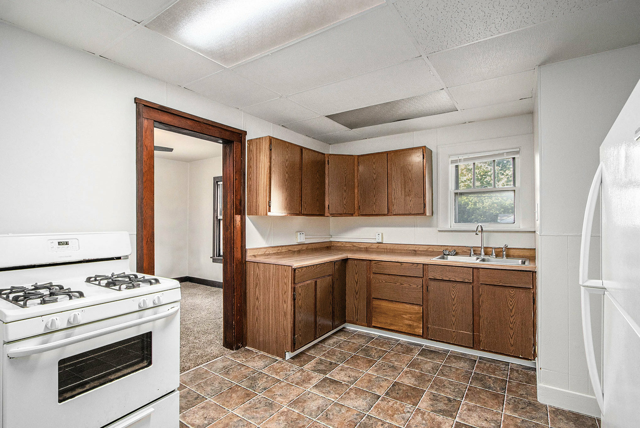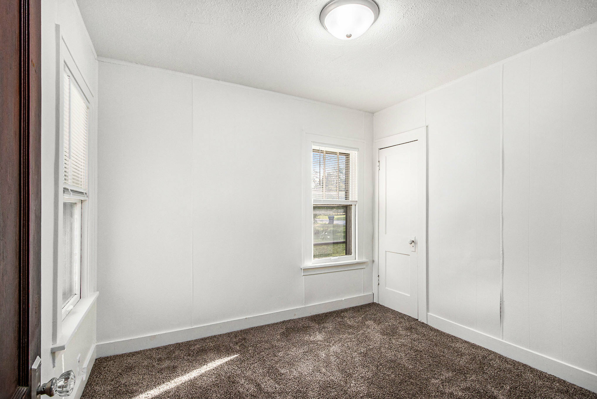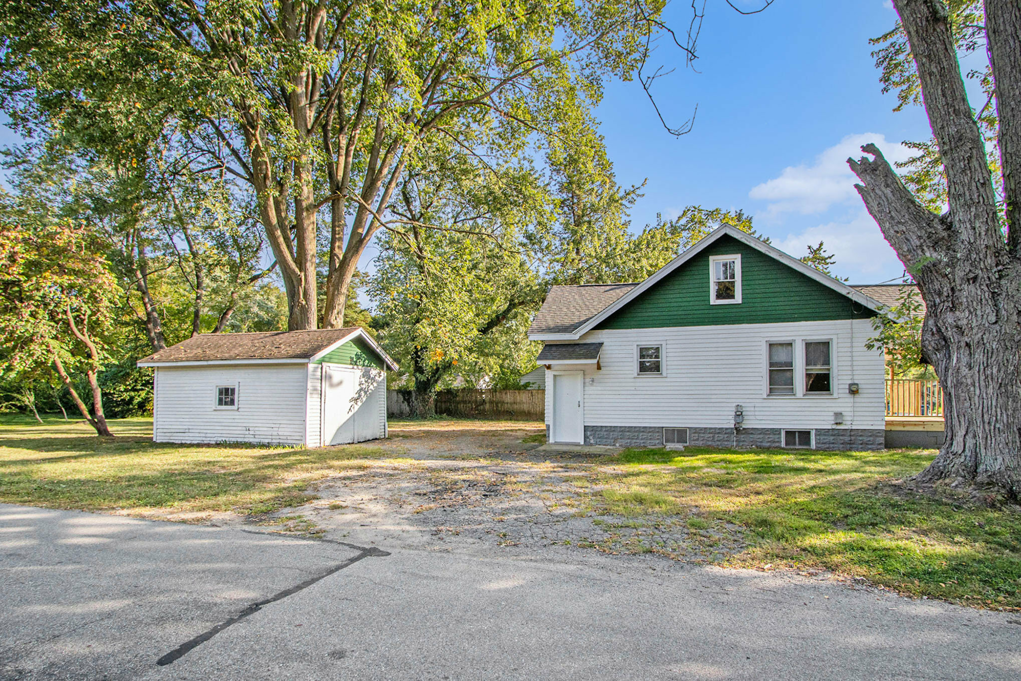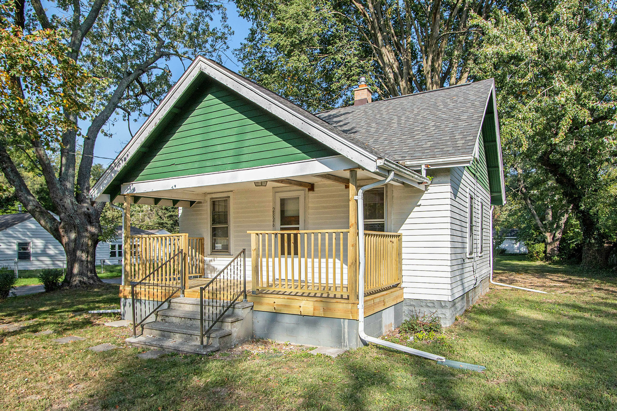 Charming 2-bedroom bungalow with covered porch, basement, stove, refrigerator, laundry hookup, all window coverings, and large storage shed.