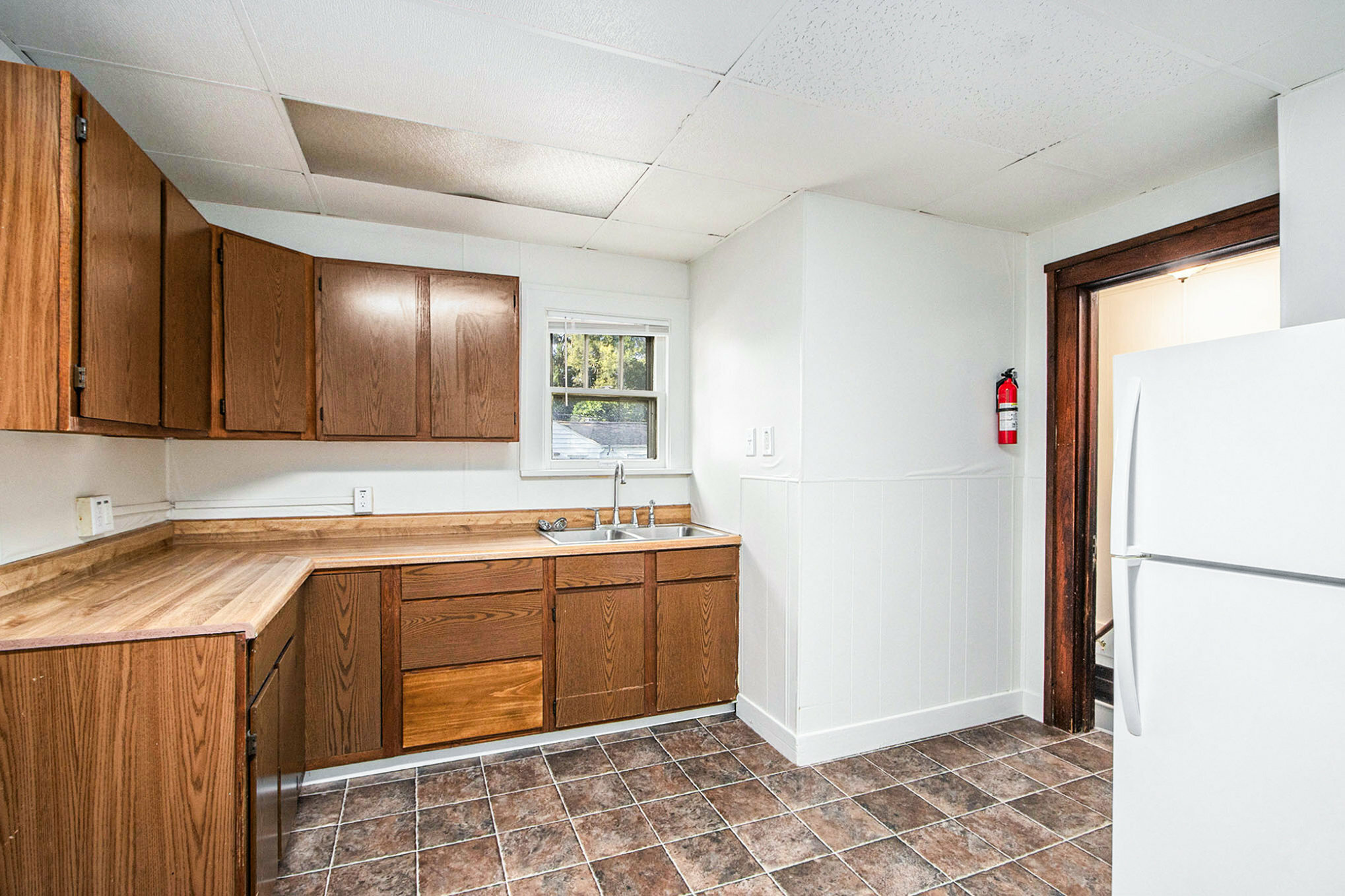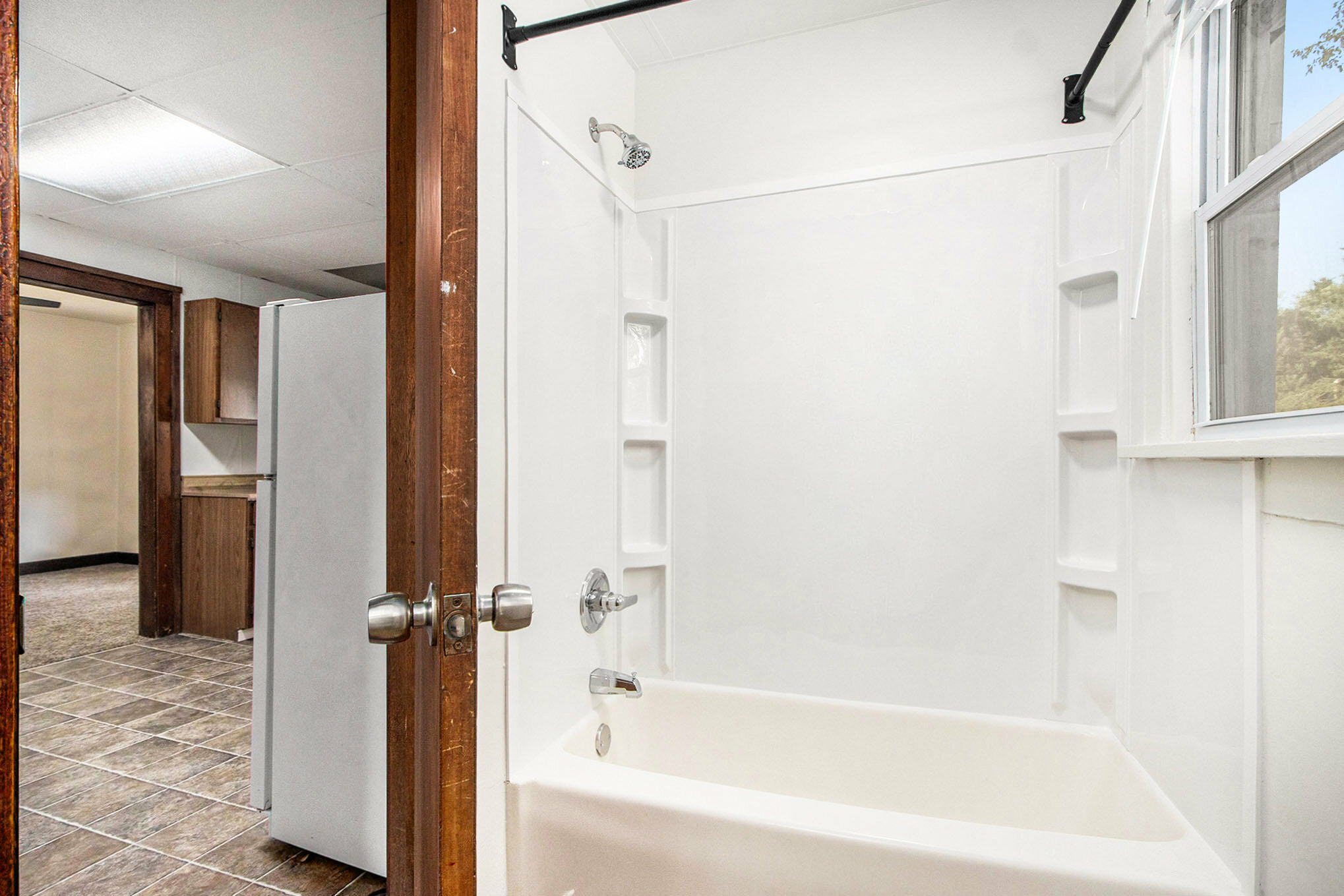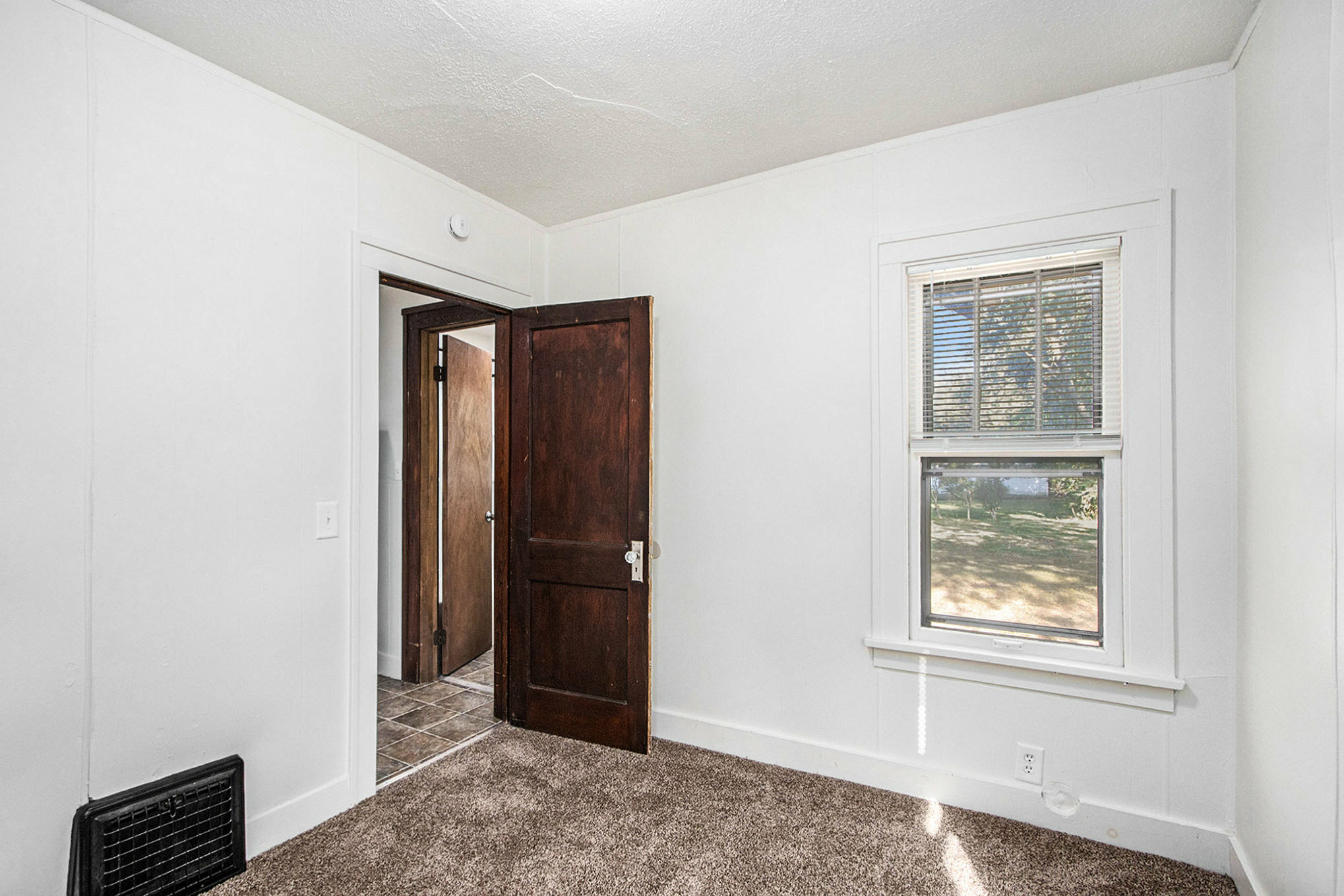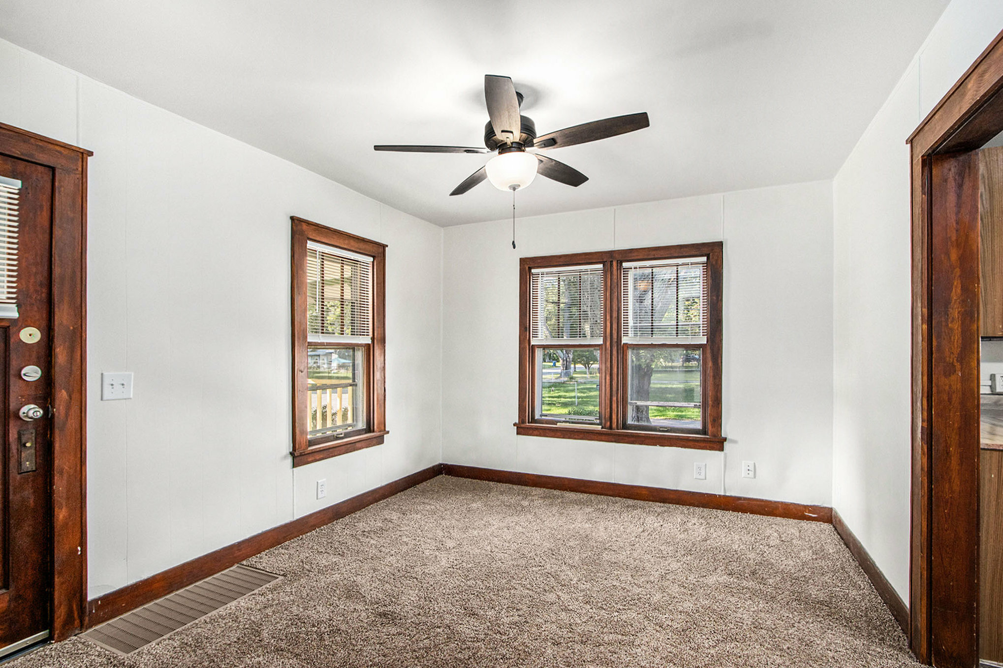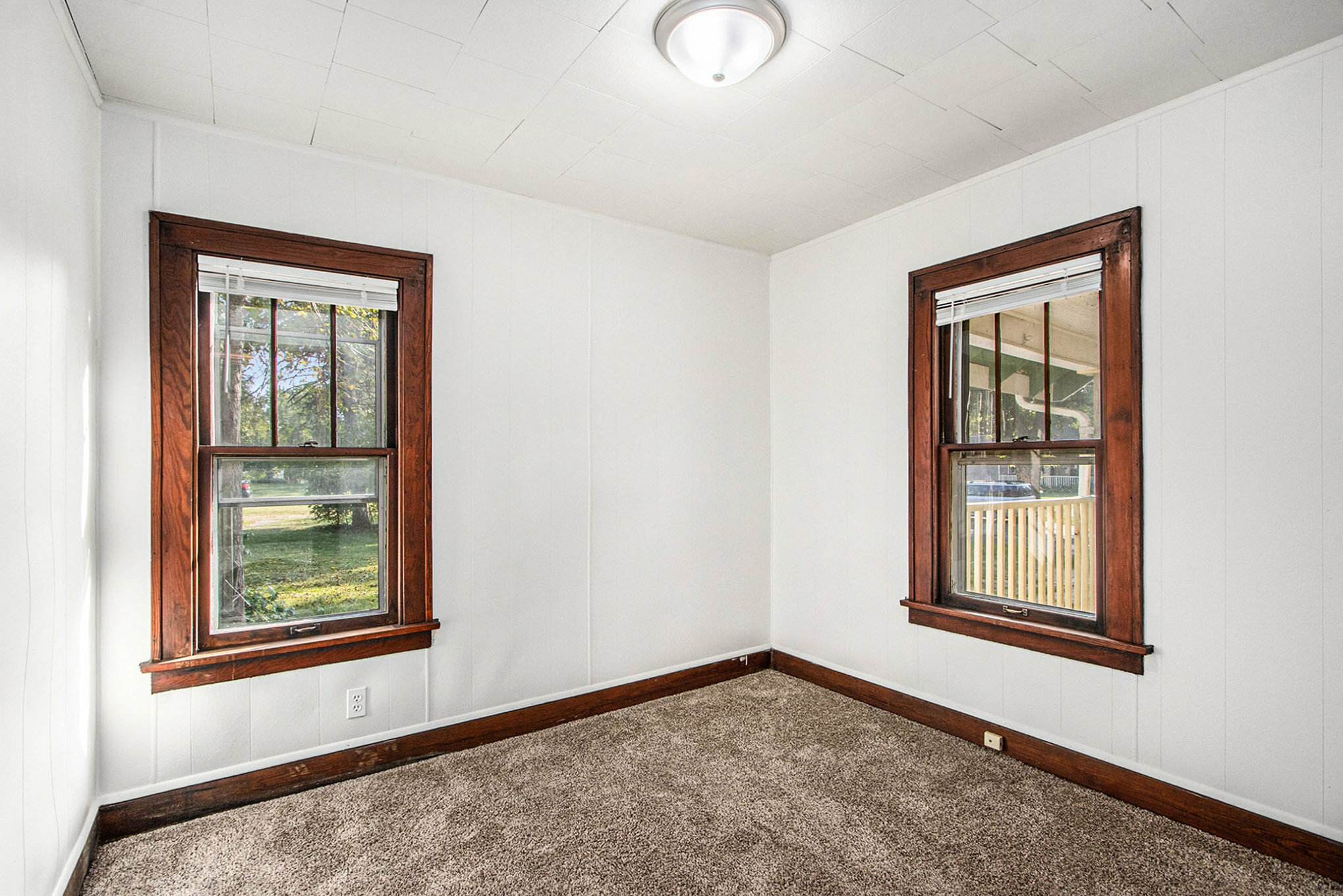 Charming 2-bedroom bungalow with covered porch, basement, stove, refrigerator, laundry hookup, all window coverings, and large storage shed.