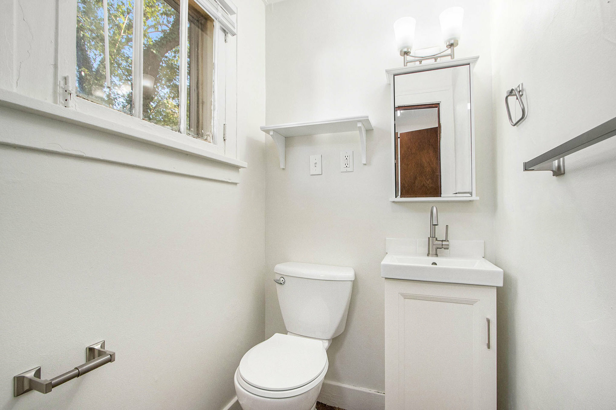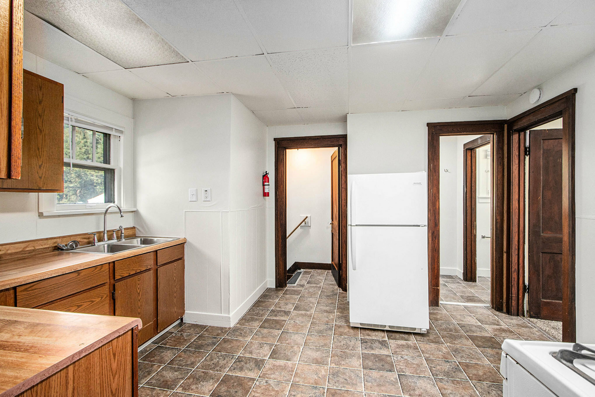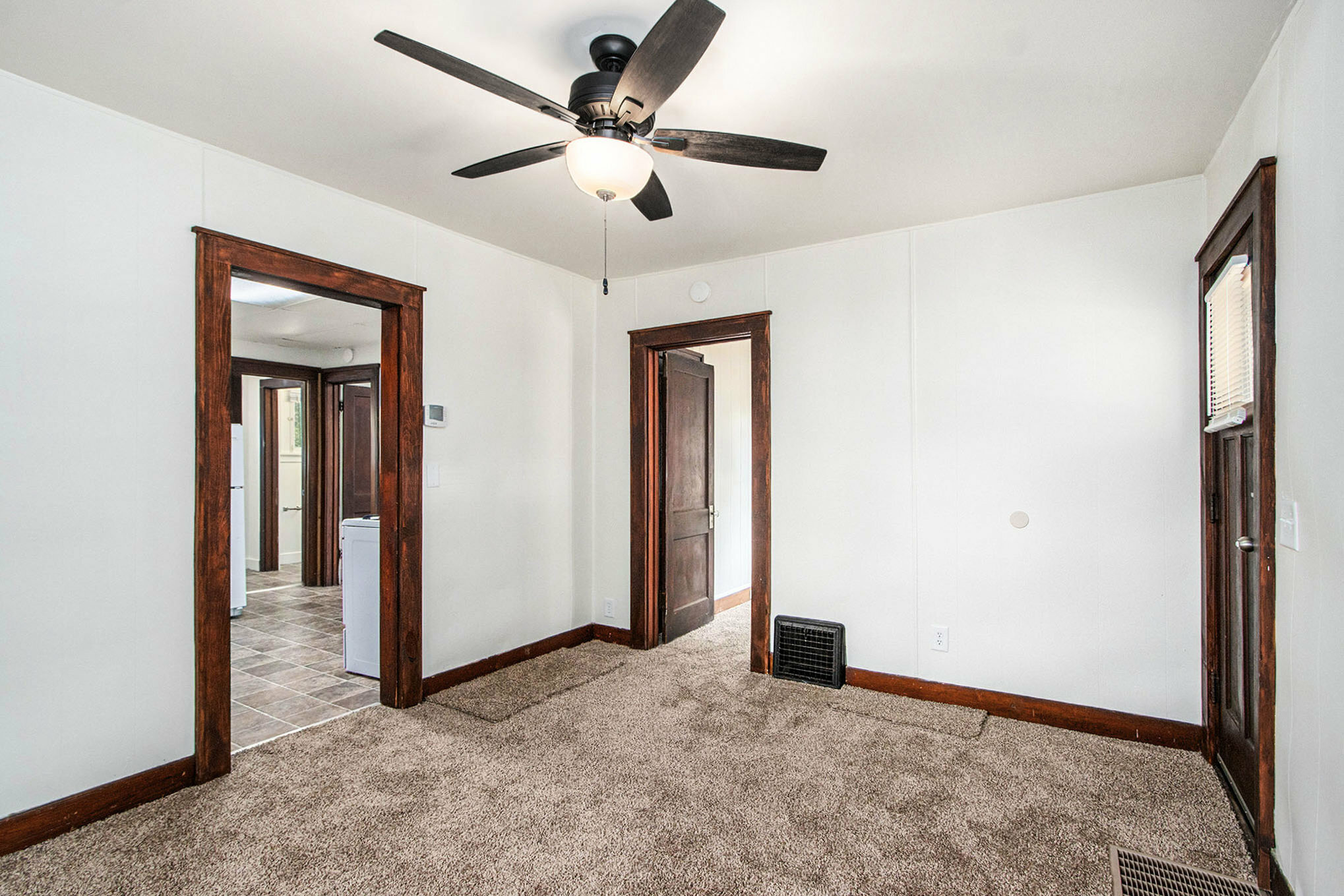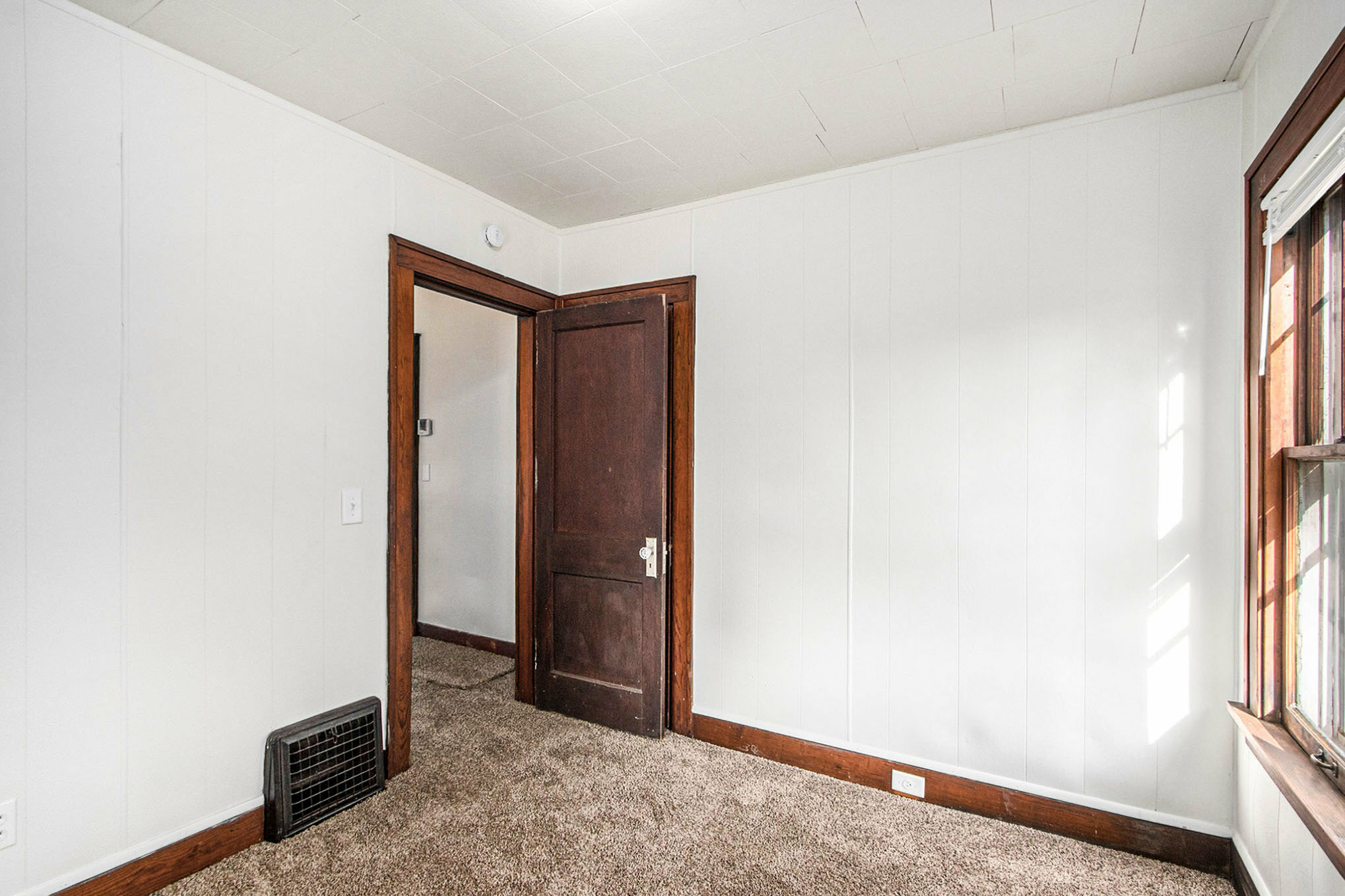 Charming 2-bedroom bungalow with covered porch, basement, stove, refrigerator, laundry hookup, all window coverings, and large storage shed.